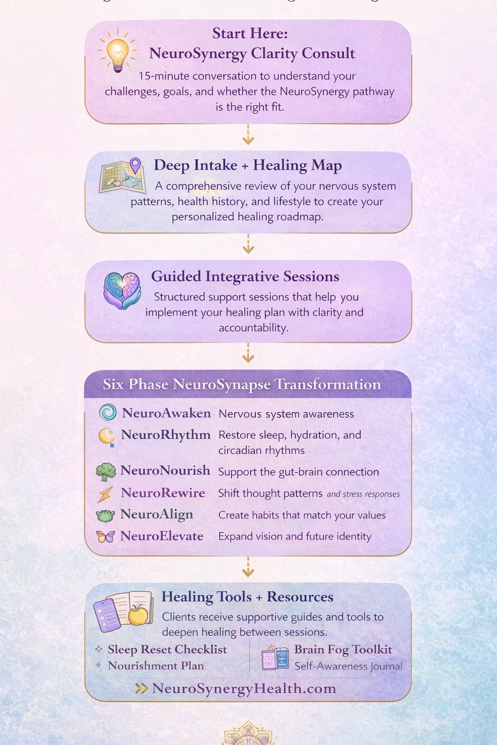 Through the NeuroSynergy approach, we take time to listen to your story, explore the patterns shaping your health, and identify the next steps that may support meaningful change.